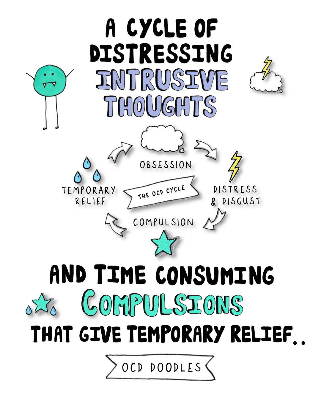OCD operates in a repetitive cycle: intrusive thoughts/obsessions → distress → compulsions → short-term relief → repeat.